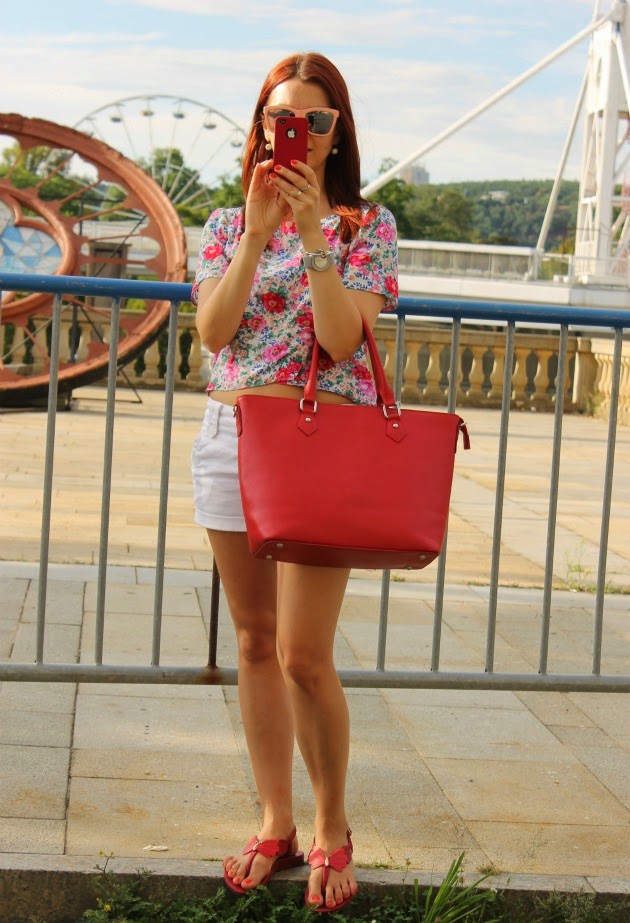 Musím říct, že ti to velmi sluší. Květovaný top je moc hezký ale teda zaujala mne kabelka. A je fajn, že i telefon máš sladěný do barvy! :-)